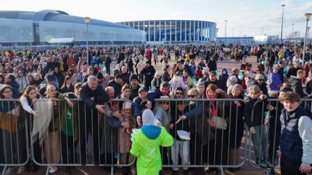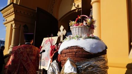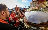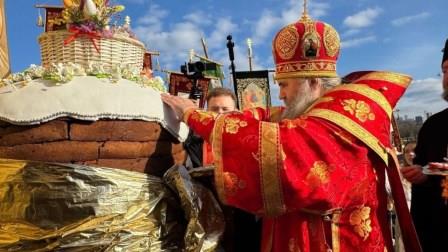 Участников Пасхального крестного хода в Нижнем Новгороде угостили гигантским куличом и царь-пасхой.