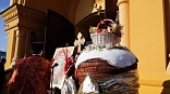 Царь-пасха весом 780 кг украшена орехами, изюмом, шоколадом и пряниками. Основание пирамиды составляет 90 см×90 см, а высота – около метра.